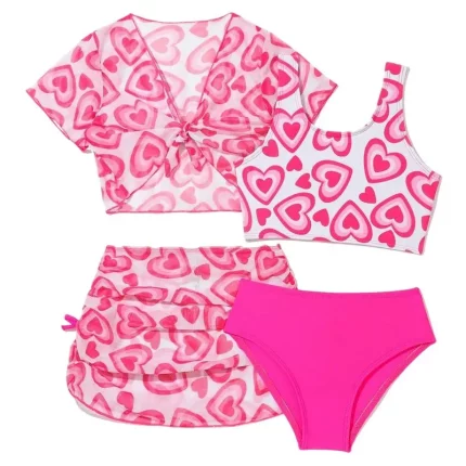 여자 4 팩 하트 프린트 비키니 세트 하이 웨이스트 수영복 어린이 여름 수영복 어린이 수영복 부드러운 통기성 비치웨어