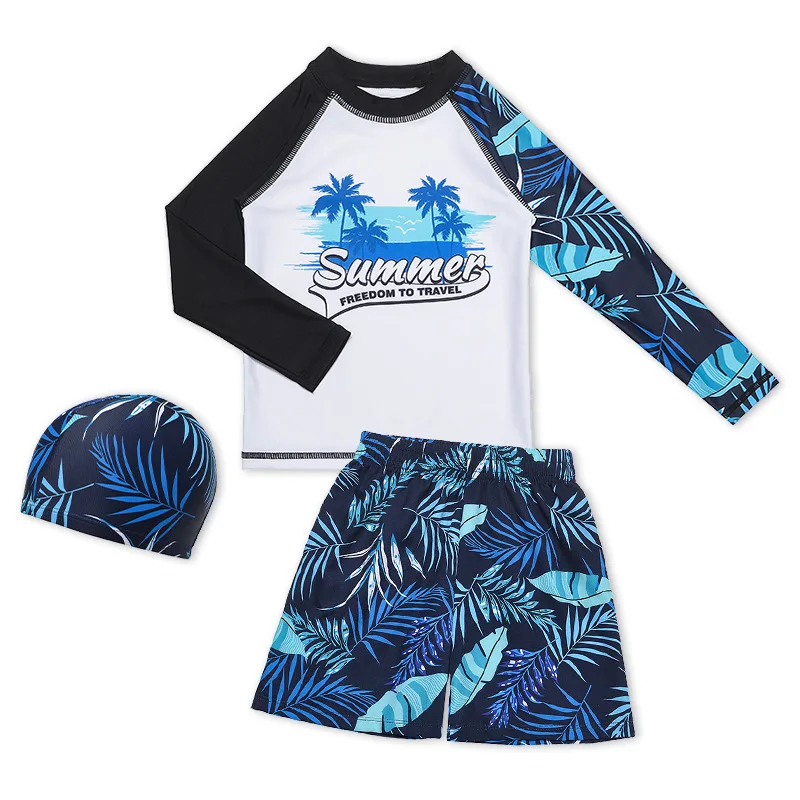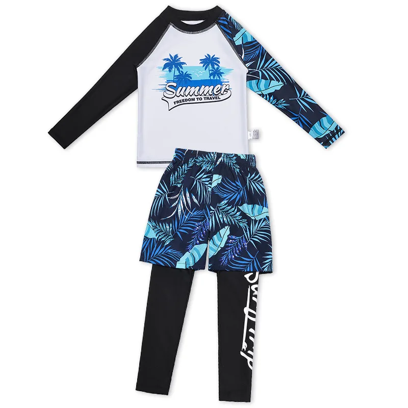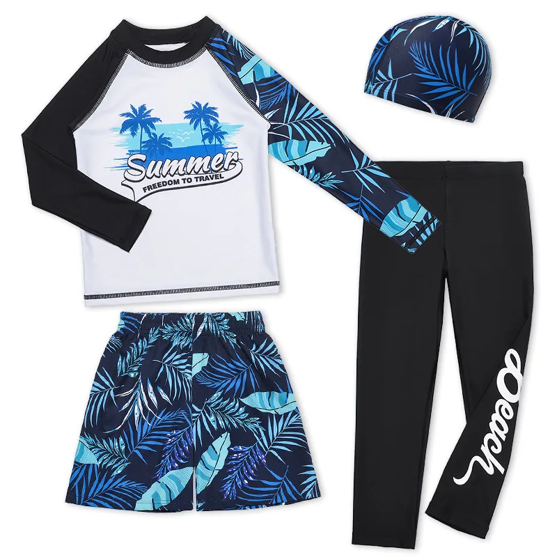 남아용 자외선 차단 수영복, UPF 50 + 긴 소매 수영복, 모자 달린 스플릿 수영복, 어린이 수영 바지, 4 개 신제품