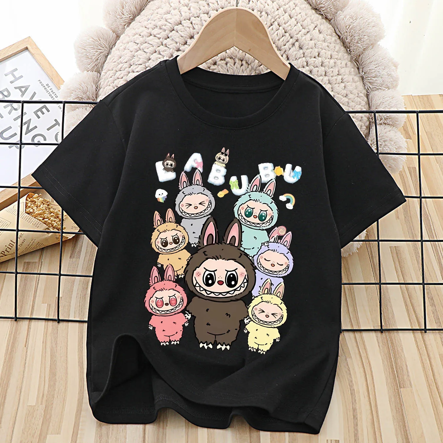 라부부 아동용 귀여운 만화 애니메이션 티셔츠 블랙 반팔 라운드넥 옷 패션 키즈 여름옷 선물