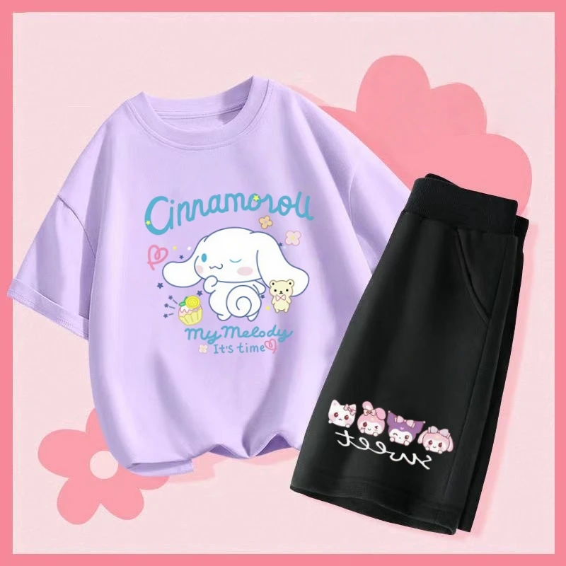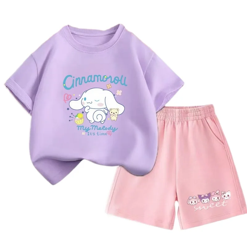 산리오 여름 아기 여자아이 옷 세트 키즈 여아 시나모롤 2피스 의상 아동 반팔 티셔츠 상의 및 반바지 세트
