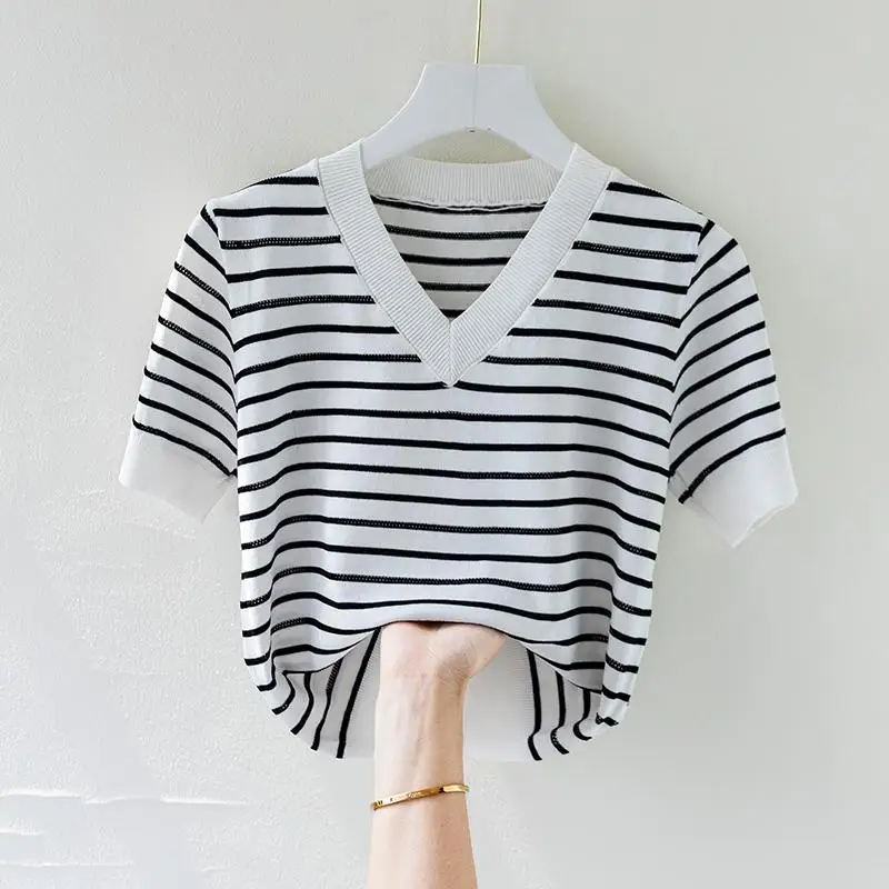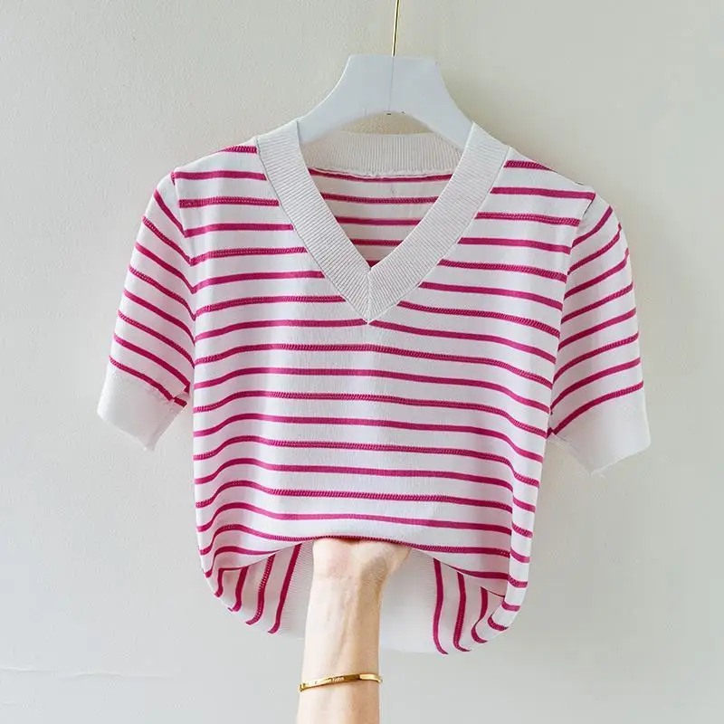 스트라이프 다목적 풀오버 여성 니트 티셔츠 여름 짧은 소매 v 넥 티셔츠 한국 의류 패션 여성 캐주얼 탑 2023
