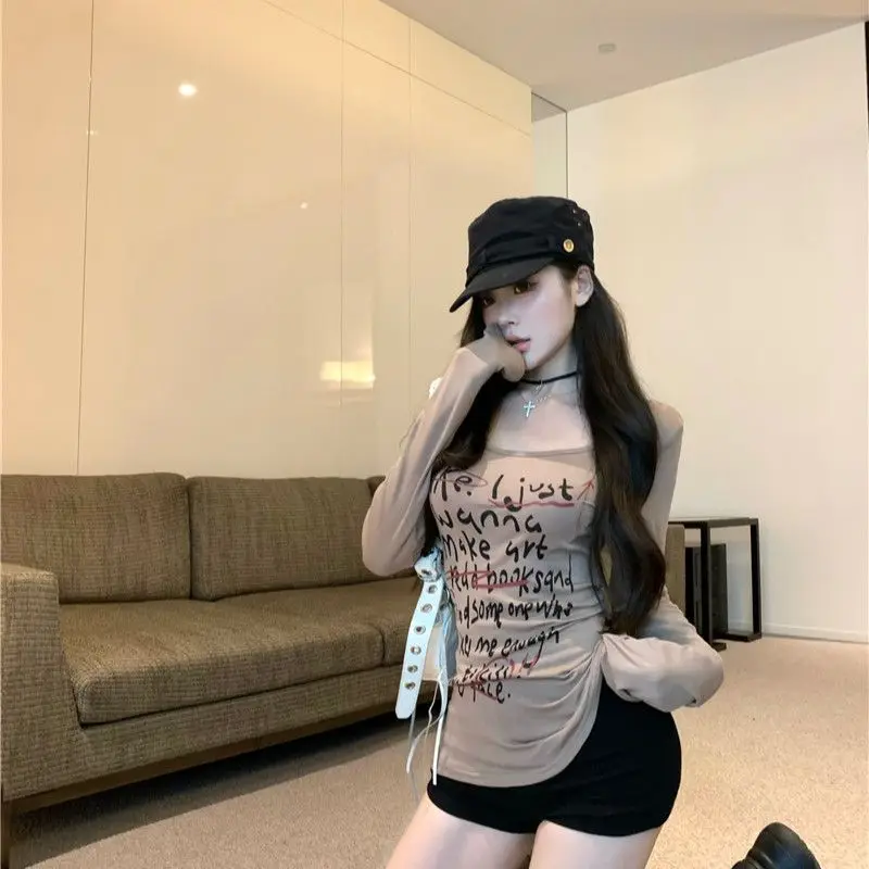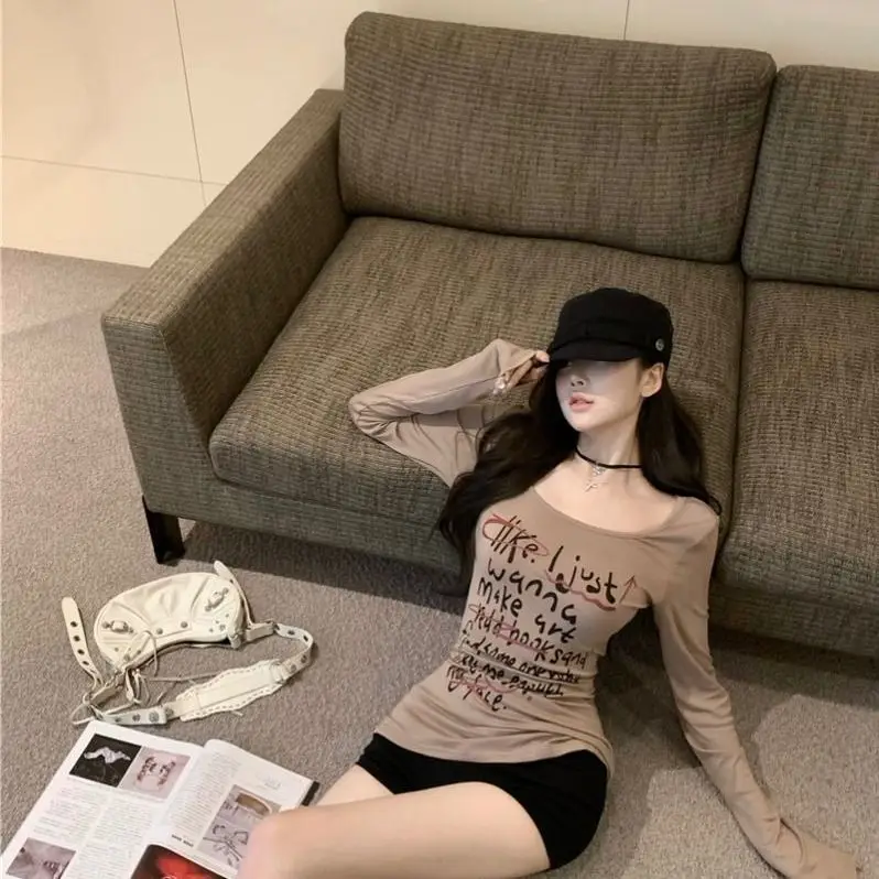 아메리칸 레터 프린트 슬림핏 긴팔 티셔츠 여성 가을 스윗 스파이시 귀여운 타이트 허리 캐주얼 탑