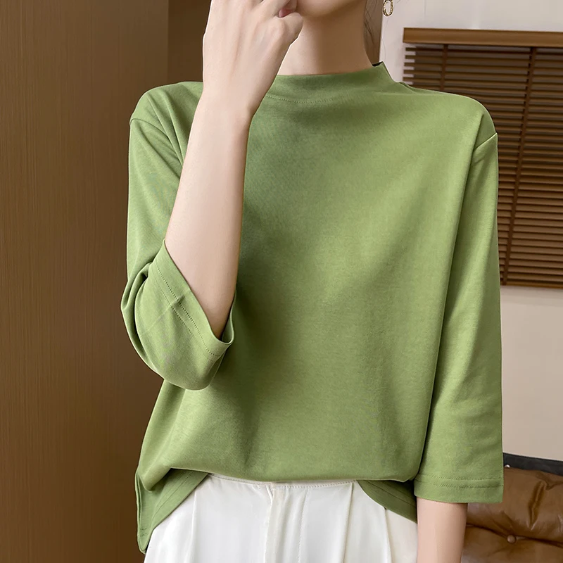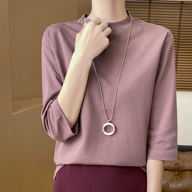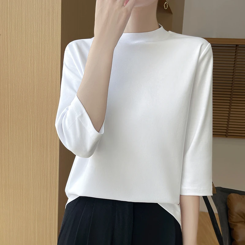 여름 가을 새로운 코튼 크로프트 슬리브 티셔츠 여성 세미 하이 넥 티셔츠 루즈 슬리브 바닥 셔츠 내부 탑 포함