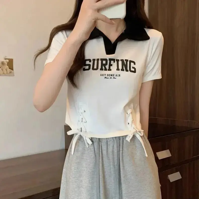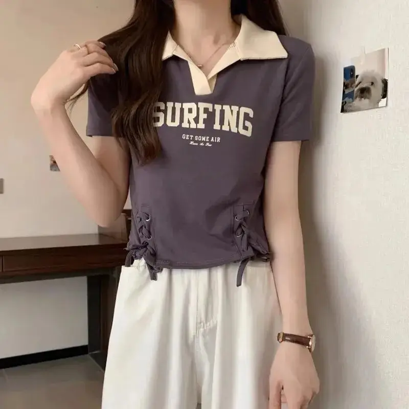 여성 의류 여름 한국 패션 단순 올 매치 편지 솔리드 컬러 폴로 칼라 Femme Thin Slim Short Sleeve Top