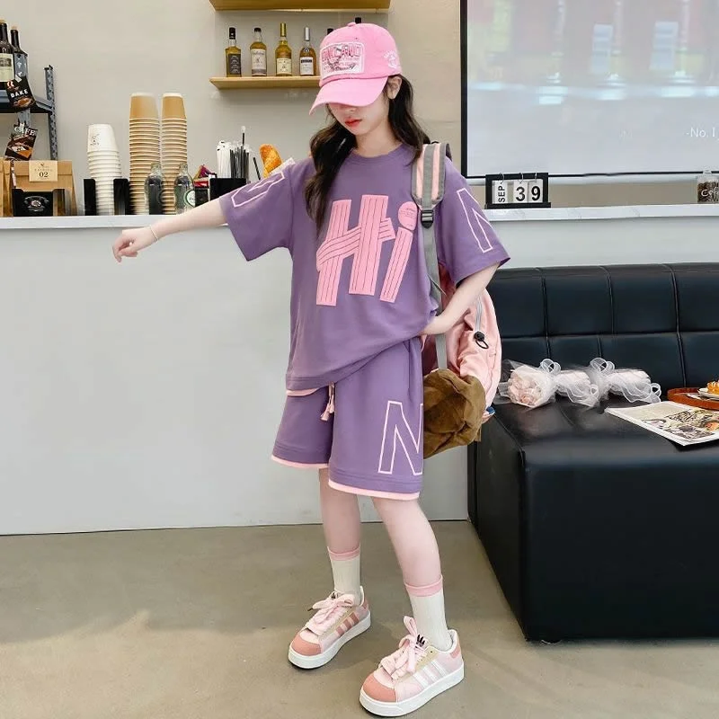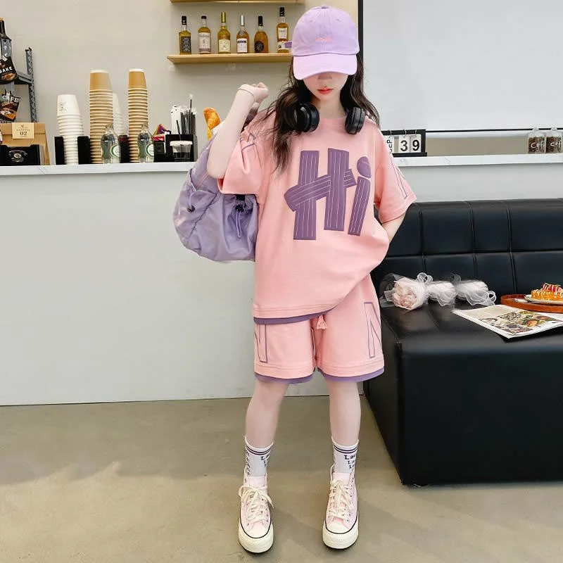 여아 티셔츠 세트, 어린이 반팔 상의 및 반바지, 십대 루즈 캐주얼 정장, 레터 프린트 의상, 여름 신상, 2 개
