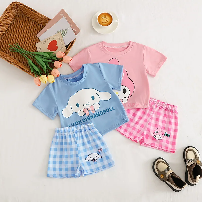 Sanrio 어린이 잠옷 세트 Cinnamoroll 헬로 키티 Kuromi Kawaii 아기 소녀 여름 편안한 반팔 격자 무늬 의류 선물