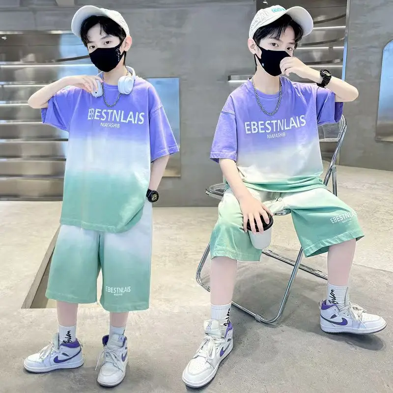 2025 여름 십대 소년 의류 세트 복장 어린이 편지 Tracksuit 어린이 t 셔츠 탑 + 느슨한 바지 반바지 바지 4 8 10 12 14 년