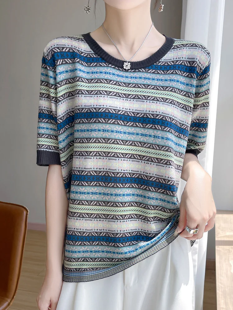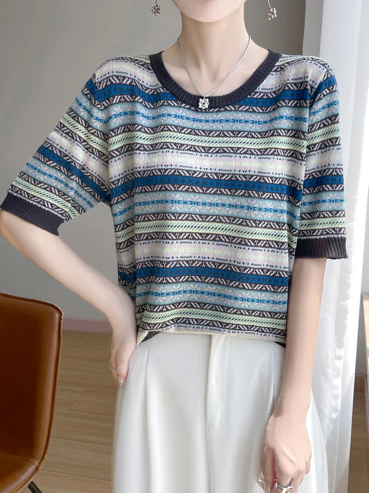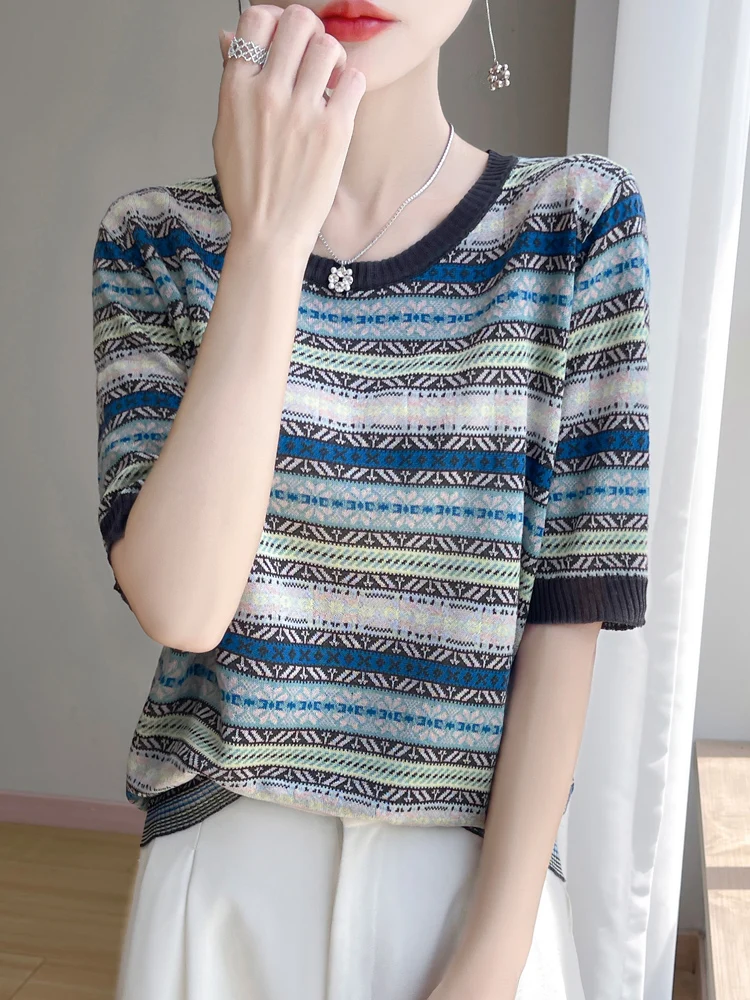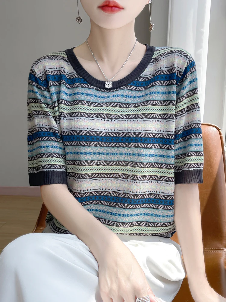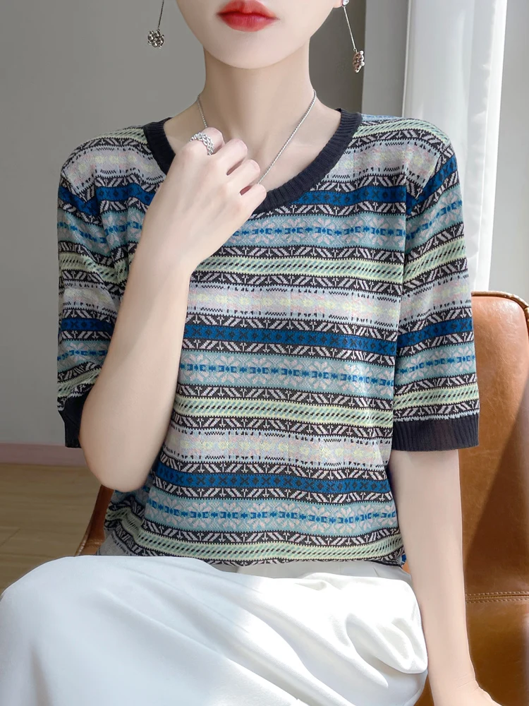 2025 신상 여름 반팔 O넥 티셔츠 스트라이프 쿨 티셔츠 여성 고급 티셔츠 패션 편안한 레저 티셔츠 탑
