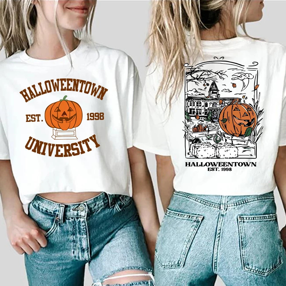 빈티지 Halloweentown 1998 티셔츠 2 사이드 프린트 Halloweentown 대학 셔츠 호박 가을 티셔츠 레트로 할로윈 파티 Tshirt