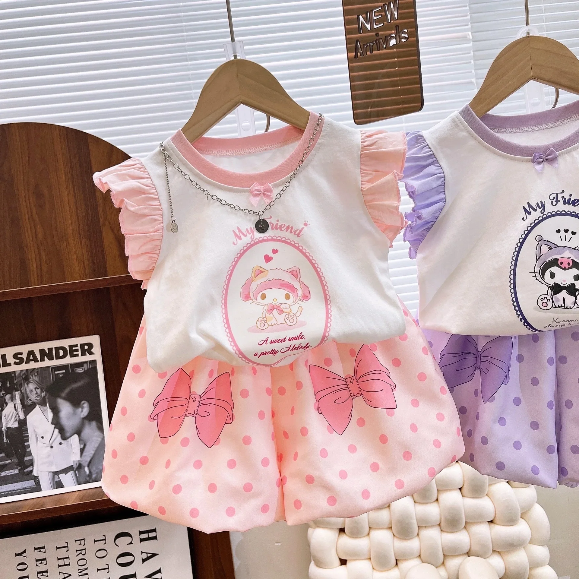 Sanrio Kuromi 어린이 야외 사진 정장 카와이 티셔츠 + 반바지 운동복 여름 소녀 잠옷 어린이 날 선물
